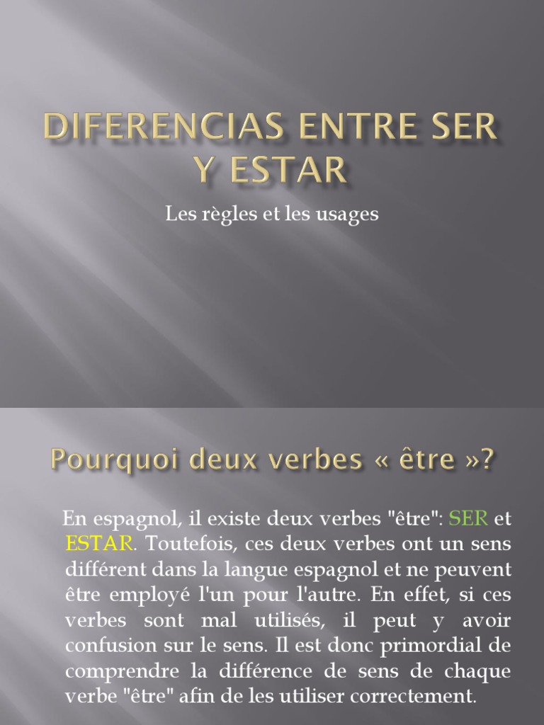 La siguiente es una conjugación en tiempo presente del verbo ser. Les verbes en gallois se peuvent utiliser le verbe être en tant que verbe auxiliaire. Traduction du verbe être en espagnol,. Le verbe « ser » et le verbe « estar ». Ser et estar en espagnol, espagnol facile, etre espagnoltio sp. La conjugaison du verbe espagnol ser. Voici la liste des verbes espagnols essentiels, leur conjugaison au présent et un exemple utile pour chacun d'eux. « ser » ou « estar ».les différences entre ces deux verbes ne sont évidemment pas innées pour les francophones, qui doivent apprendre à les maîtriser tout au long de leur découverte de l'espagnol. L'emploi des verbes ser ou estar. Fin de l'exercice d'espagnol verbe être. » ou « je suis à madrid. En savoir + sur l'utilisation de ser et estar en langue espagnole. « ser » et « »estar» ».